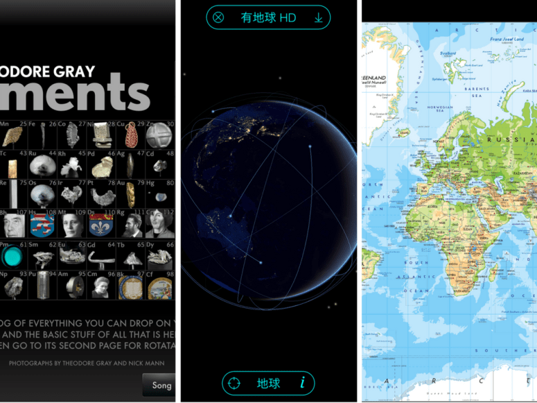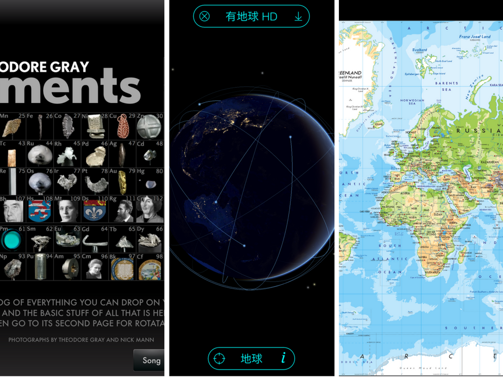 以上三套APP,從左而右,分別是 The Elements(化學元素表)、Solar Walk(地球科學)、The world HD(地理),括號裡的則是可以應用的學科,超級好用的軟體!