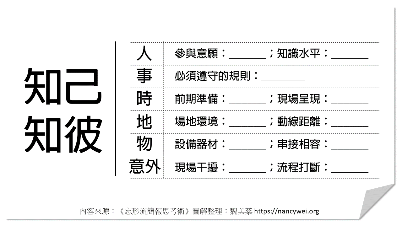 既然忘形流中的核心為故事,那到底我們要如何蒐集這些素材呢?忘形提供了六個思考的角度,以事件為起始點,將事件中重要的元素一一汲取出來,譬如記憶點、細節等,其中這邊特地將簡報中期望傳達的情感進行設定或釐清,以及後續想要給予聽眾的啟發與思考。透過這張表,著實地可以讓我們針對生活周遭的事件進行更細膩的觀察。