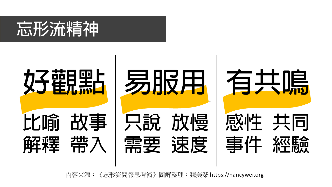 簡報要能成功在《忘形流簡報思考術》中,提到三個層級:你屬於重量級人物,說什麼別人都信;你講的可以走進聽眾的情感裡,距離近了什麼都好談;你把資訊傳遞情楚,透過萃取出的重點,串接有邏輯的脈絡,讓別人願意相信並跟著去做,這三者是我們在進行簡報時,可以做為努力的目標!