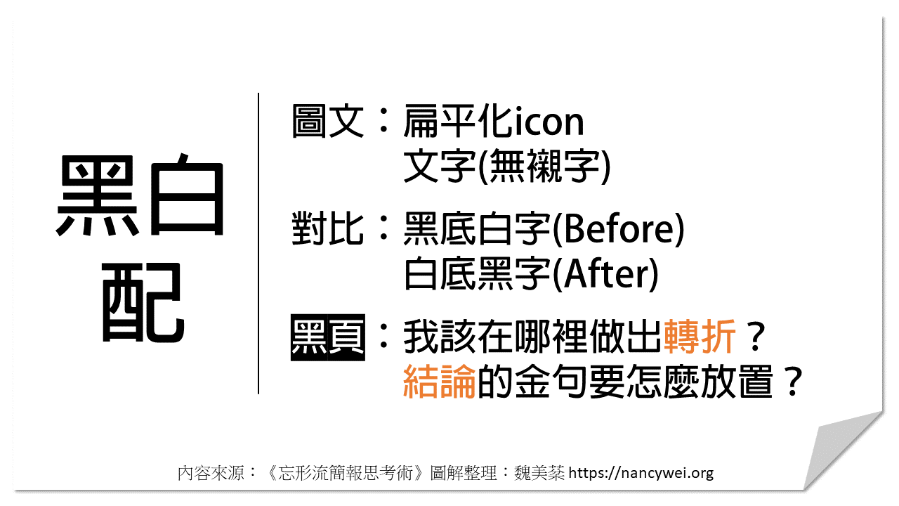 在一邊整理筆記的時候,就會忍不住去想,怎麼讓這份筆記更具備架構性,我得說真是越做越有FU,忘形流裡面也很強調金句,做著做著忍不住就會去想,怎麼樣用念起來會更順,當然這是題外話啦,但「選圖」、「用字」、「黑白配」這幾個詞就在製作忘形流的簡報中生出來了。
