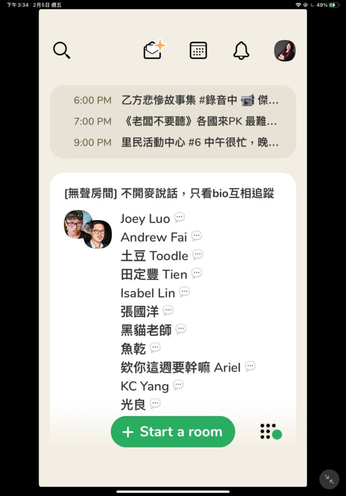 原來,只要先申請帳號,代表你有機會出現在別人的通訊錄列表中,此時對方不需要用掉邀請函的份額,只要一樣可以 Let them(us) in! 於是就開啟了逛房間的旅程!在它的介面上,主要是二個畫面:正開著的聊天室、你能聊天的追蹤者。操作主要是左滑跟右滑。