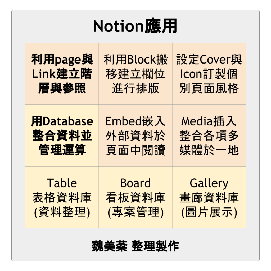 右邊的這張,則是將Notion中提到的幾個功能提一下,當太多資訊近來時,先抓住幾個關鍵詞,細部的操作再後續補充跟累積,先讓自己對這套軟體有個底。